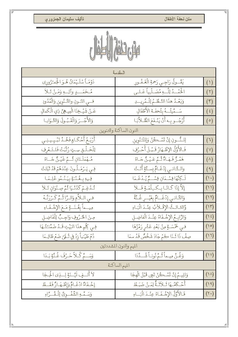 متن تحفة الاطفال مكتوبة كاملة مع الشرح سليمان الجمزوري