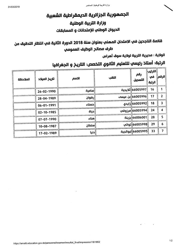 نتائج مسابقة استاذ رئيسي 2019 مديرية التربية لولاية سوق اهراس