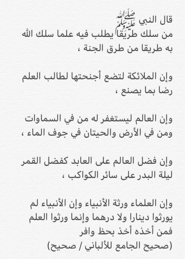 عبدالله الصرعاوي Auf Twitter قالﷺ من سلك طريقا يطلب فيه علما سلك الله به طريقا من طرق الجنة وإن الملائكة لتضع أجنحتها لطالب العلم رضا بما يصنع وإن العالم ليستغفرله من في